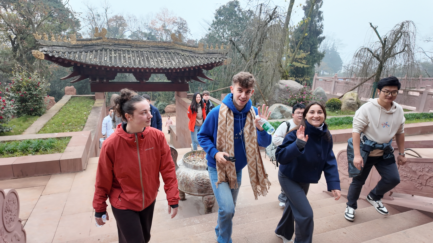 随后,嘉宾团前往蒙顶山风景区,沿着绿意盎然的山道攀登至天盖寺。