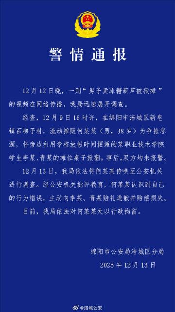 四川省绵阳市公安局涪城区分局12月13日晚发布警情通报:12月12日晚,一则“男子卖冰糖葫芦被掀摊”的视频在网络传播,我局迅速展开调查。经查,12月9日16时许,在绵阳市涪城区新皂镇石梯子村,流动摊贩何某某(男,38岁)为争抢客源,将旁边利用学校放假时间摆摊的某职业技术学院学生李某、青某的摊位桌子掀翻。事后,双方均未报警。12月13日,我局依法将何某某传唤至公安机关进行调查。经公安机关批评教育,何某某认识到自己的行为错误,主动向李某、青某赔礼道歉并赔偿损失。目前,我局依法对何某某处以行政拘留。