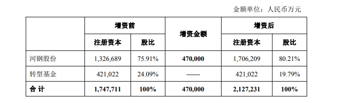 经各方商定,河钢股份以自有资金向乐钢增资47亿元,而转型基金未参与本次增资事宜。本次增资完成后,乐钢注册资本由174.8亿元增至212.72亿元,其中河钢股份持股比例由75.91%增至80.21%,转型基金持股比例由24.09%稀释至19.79%。本次增资款中379520万元计入乐钢注册资本,其余90480万元计入乐钢资本公积。河钢股份进一步加深对子公司的控制权,乐钢财务结构得以优化,符合公司的长远利益。