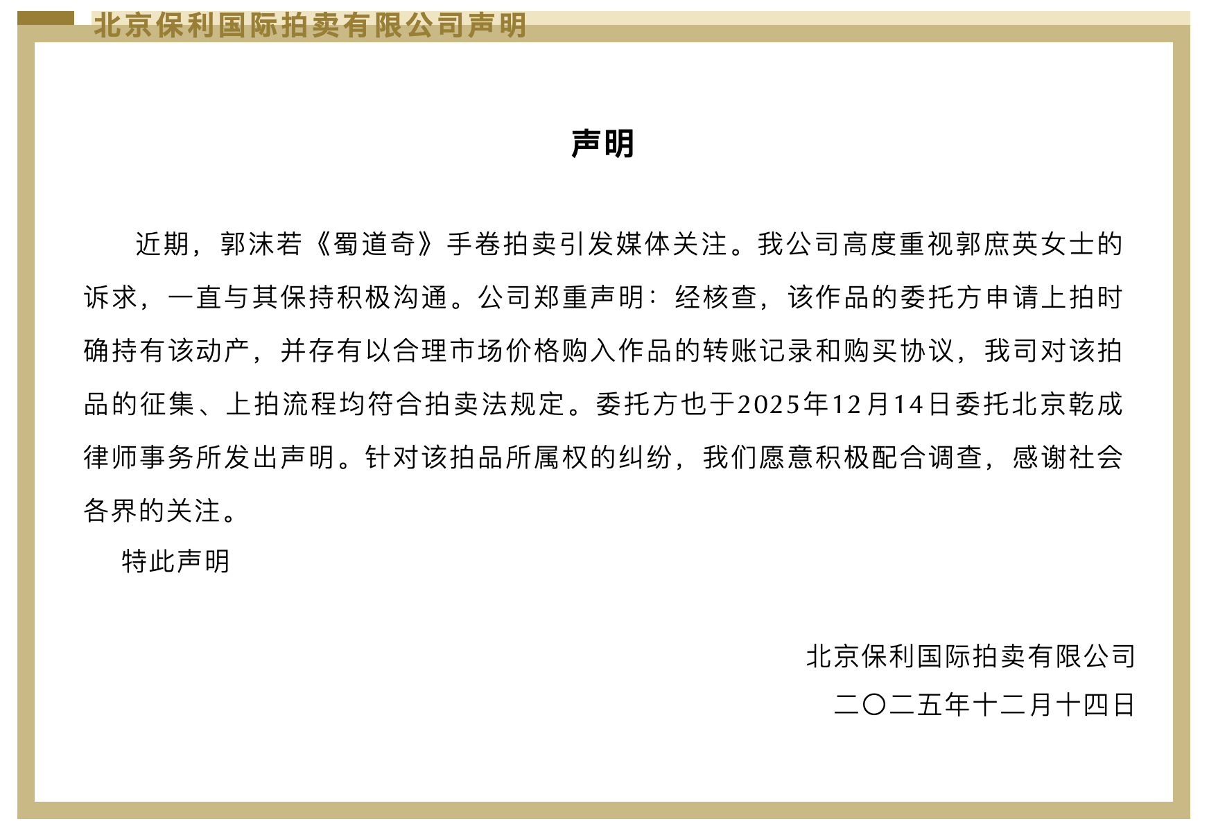 12月14日晚,针对郭沫若《蜀道奇》手卷拍卖一事,北京保利国际拍卖有限公司发布声明称,公司高度重视郭庶英女士的诉求,一直与其保持积极沟通。经核查,该作品的委托⽅申请上拍时确持有该动产,并存有以合理市场价格购入作品的转账记录和购买协议,公司对该拍品的征集、上拍流程均符合拍卖法规定。