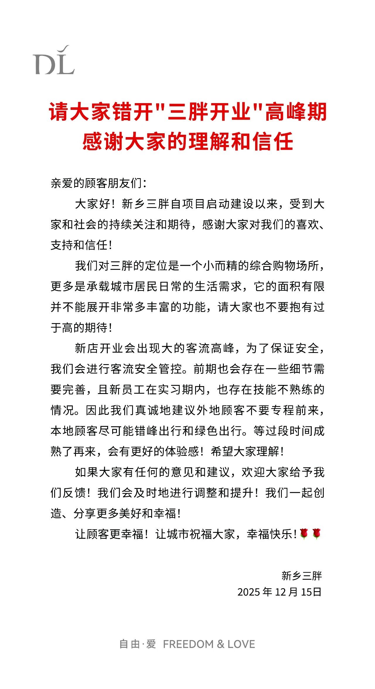 新乡三胖12月15日发文称,请大家错开“三胖开业”高峰期,我们对三胖的定位是一个小而精的综合购物场所,面积有限并不能展开非常多丰富的功能,请大家不要抱有过于高的期待。
