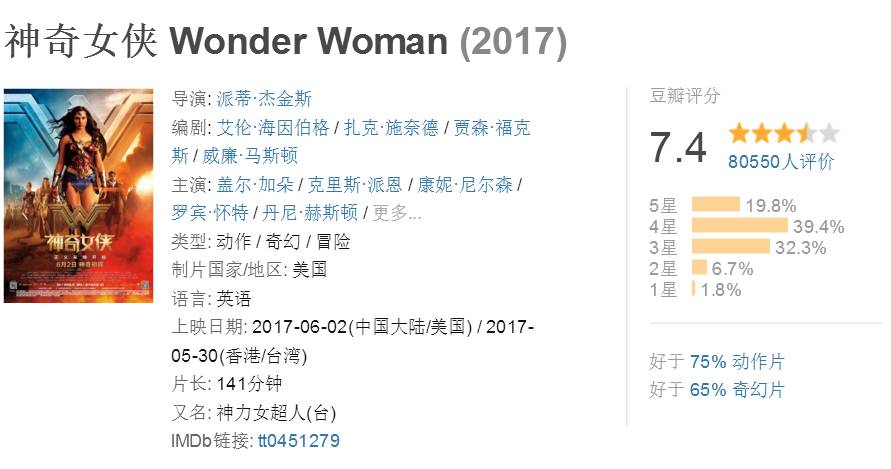 而在豆瓣评分上,《神奇女侠》由8.2分下降至7.4分,口碑出现了较为严重的滑坡。和其开画时的火爆程度相比,如今后劲已经出现明显不足可能并没有完全符合许多影迷的期待。