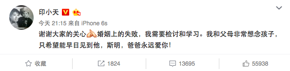 6月6日,印小天在微博发文回应这两天关于他遭“骗婚门”的爆料,引发网上热议。对此,印小天在微博中写道“谢谢大家的关心,婚姻上的失败,我需要检讨和学习。我和父母非常想念孩子,只希望能早日见到他,斯明,爸爸永远爱你!”
