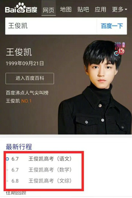 明天就是高考的第一天,而高三考生王俊凯也将奔赴考场,百度百科中甚至还更新了王俊凯的最新行程。