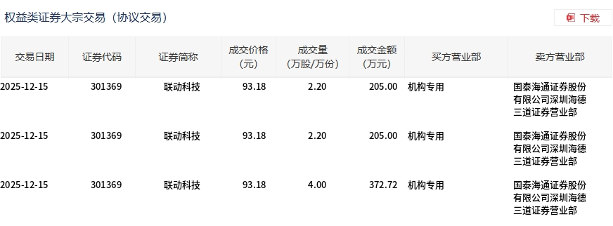 12月15日,联动科技大宗交易成交8.4万股,成交额782.72万元,占当日总成交额的5.36%,成交价93.18元,较市场收盘价118.32元折价21.25%。