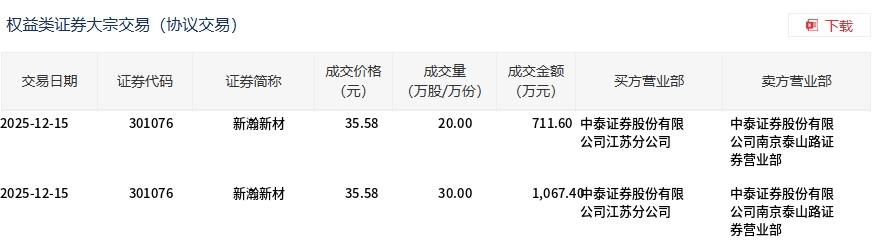 12月15日,新瀚新材大宗交易成交50万股,成交额1779万元,占当日总成交额的13.34%,成交价35.58元,较市场收盘价41.43元折价14.12%。