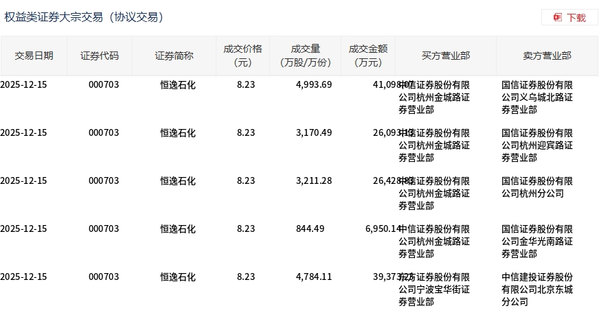 12月15日,恒逸石化大宗交易成交1.7亿股,成交额13.99亿元,占当日总成交额的84.02%,成交价8.23元,较市场收盘价8.23元持平。