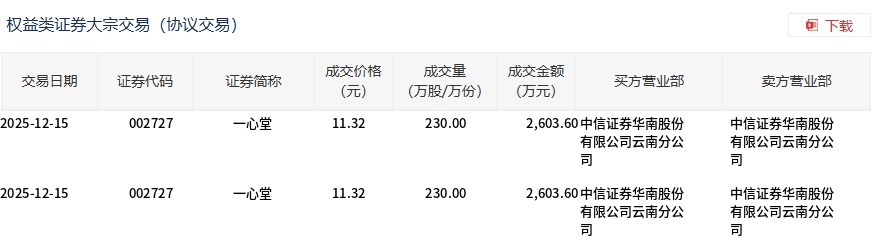 12月15日,一心堂大宗交易成交460万股,成交额5207.2万元,占当日总成交额的49.78%,成交价11.32元,较市场收盘价12.56元折价9.87%。