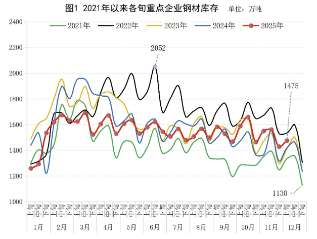 12月15日,中钢协数据显示,2025年12月上旬,重点统计钢铁企业钢材库存量1475万吨,环比上一旬增加47万吨,增长3.3%;比年初增加238万吨,增长19.2%;比上月同旬减少74万吨,下降4.8%;比去年同旬增加57万吨,增长4.0%,比前年同旬增加65万吨,增长4.6%。