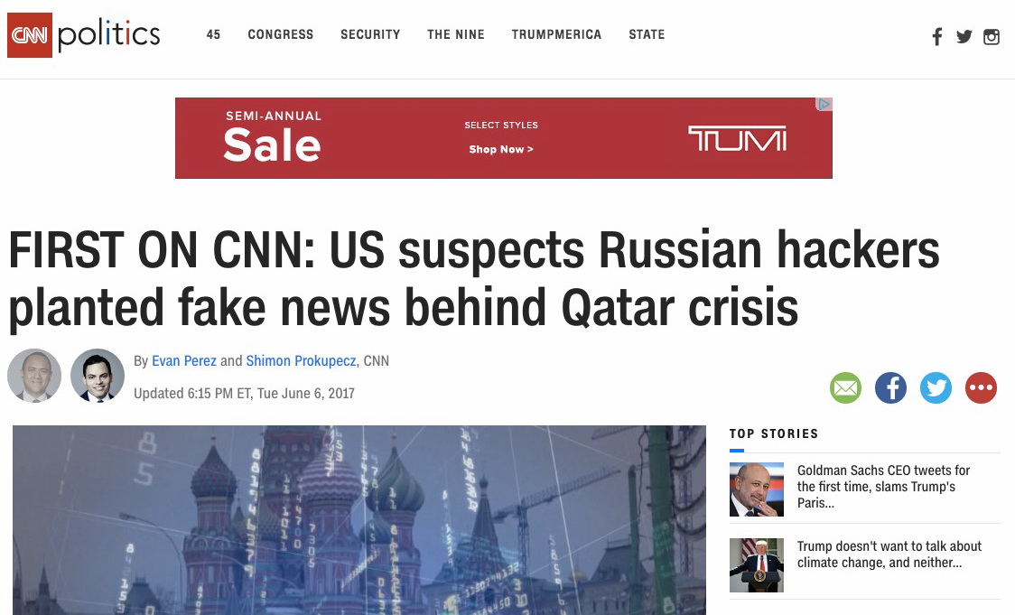 【美国怀疑俄罗斯黑客植入假新闻引发卡塔尔危机】据美国有线电视新闻网(CNN)6月6日报道,美国联邦调查局(FBI)相信,俄罗斯黑客入侵卡塔尔国家新闻机构,并植入了一篇直接导致卡塔尔陷入外交危机的假新闻。
