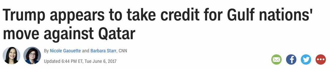 特朗普的第一条推特写道:“我曾在近日访问中东时表示,激进的意识形态将不会再得到资金支持。看,各国指向了卡塔尔!”多名分析师认为,他的介入会引起外界对美国的质疑,人们会认为美国在该地区扮演了一个“公正的独裁者”的角色。一名来自阿拉伯海湾国家机构的访问学者表示,“特朗普只是在向所有人示好而缺乏决断”,此番表态“坐实了他团队以对抗恐怖主义和伊朗为先的策略”。