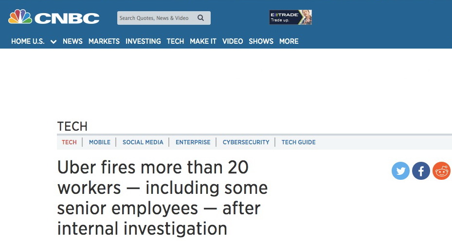 【Uber在内部调查后开除多名高级雇员】据CNBC报道,美国叫车服务软件巨头优步(Uber) 在一场内部调查行动中开除了包括多名高级雇员在内的20余名员工。一名优步前员工此前指责该公司内部存在性别歧视以及性骚扰问题,为此,优步首席执行官卡兰尼克(Travis Kalanick)紧急展开内部调查以应对这项指控。目前,律师事务所Perkins Coie正在对优步的1.4万员工进行评估。