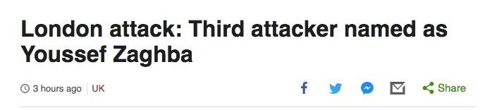 【伦敦桥恐袭事件第三名肇事者身份曝光】据BBC报道,第三名伦敦桥恐怖袭击者名叫Youssef Zaghba,是一名22岁的摩洛哥裔意大利男子。早前媒体报道,另两名恐怖袭击者分别是生于巴基斯坦的27岁男子Khuram Butt,以及30岁的Rachid Redouane。
