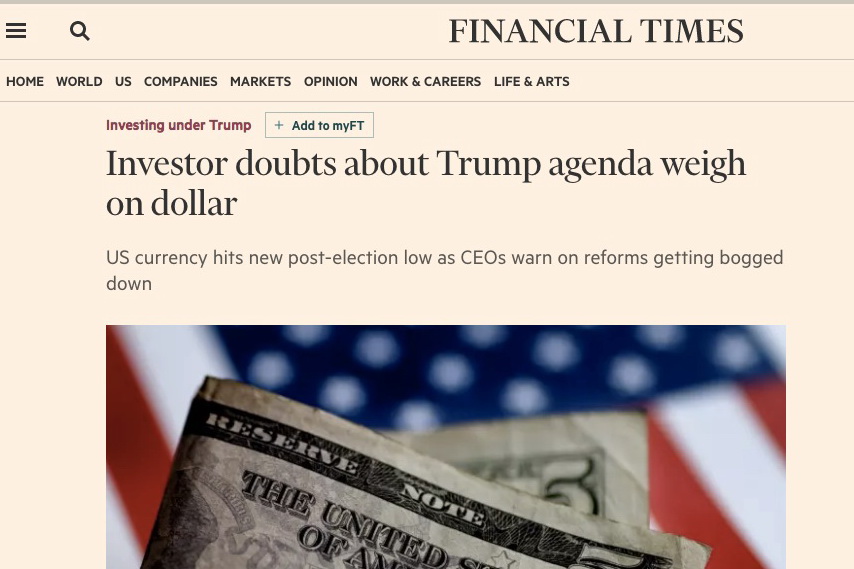 【投资者怀疑特朗普议程对美元的影响】据《金融时报》报道,随着美国国债收益率和美元汇率降至大选过后的新低位,而同时其股市越来越依赖科技股维持高位,投资者愈加怀疑特朗普政府会造成新一轮的经济震荡。