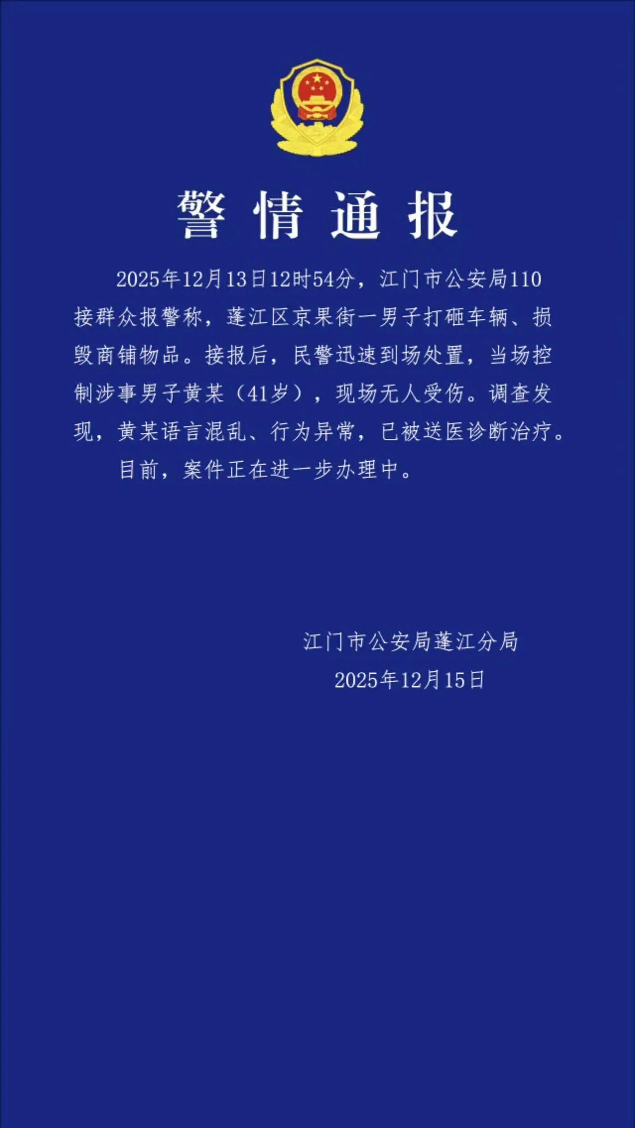 12月15日,广东省江门市公安局蓬江分局发布警情通报:12月13日12时54分,江门市公安局110接群众报警称,蓬江区京果街一男子打砸车辆、损毁商铺物品。接报后,民警迅速到场处置,当场控制涉事男子黄某(41岁),现场无人受伤。调查发现,黄某语言混乱、行为异常,已被送医诊断治疗。目前,案件正在进一步办理中。