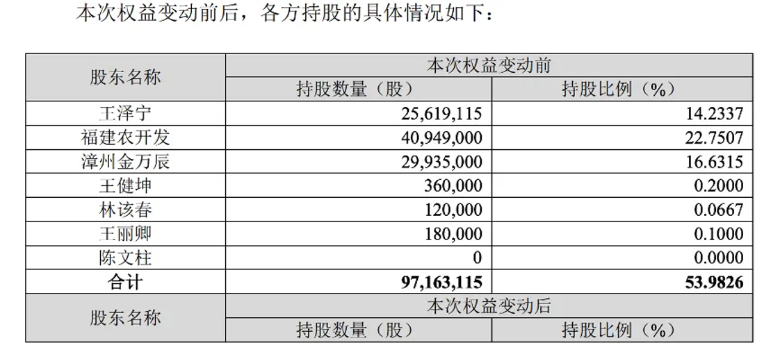 早在2015年,王泽宁的姑姑王丽卿以及表叔陈文柱分别以总价1元将其股份转让给王泽宁,后者通过福建农开发和漳州金万辰对万辰集团实现了控股。