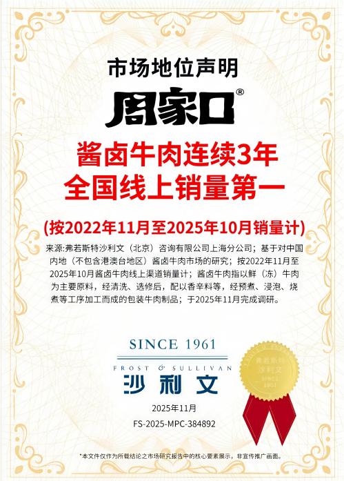 在消费升级与数字化转型浪潮下,周家口牛肉以三维市场布局为骨架,以精准人群定位为血肉,以非遗工艺为核心竞争力,既守住老字号的品质初心,又抓住新消费趋势机遇,最终实现线上销量持续领跑。未来,随着全国化布局的深入,周家口牛肉有望在酱卤赛道再创佳绩。