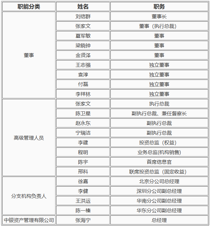 目前中银基金有5名非独立董事,除了董事长刘信群、执行总裁张家文之外,董事梁晓钟也来自中国银行,为总行风险管理部副总经理。高管共有8名,三名副执行总裁陈卫星、赵永东、宁瑞洁也均来自中国银行。