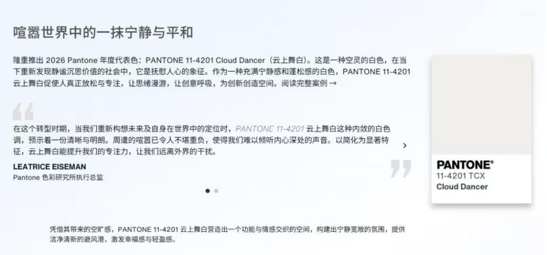 近日,全球色彩研究所潘通(PANTONE)发布2026年度年度代表色彩———「云上舞白」(PANTONE 11-4201 Cloud Dancer),官方解读其为一种“轻盈”“平静”“蓬松”的色彩,这也是潘通首次选定白色作为年度代表色。