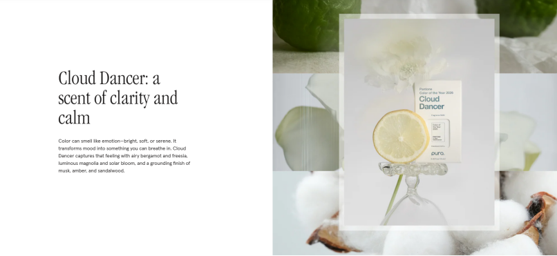 不过,在美妆领域,截至目前仅有香水品牌普拉(PURA)宣布与潘通进行今年的流行色合作。PURA推出同名香水Cloud Dancer,将颜色转换为氛围与香气,探索色彩如何通过香气赋予生命,唤起情感。这款香水选用佛手柑和苍兰、檀香等香料,呈现出一种轻盈、明亮的花香调气息,核心的感受是“平静”,呼应于「云上舞白」的设计理念。