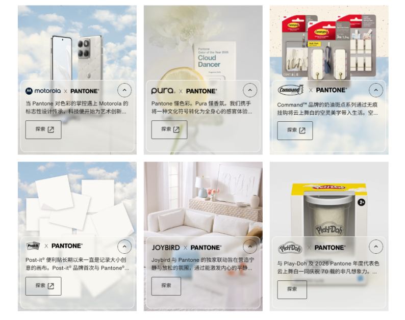 从市场端看,家居行业更青睐与年度潘通色进行官方联名。家具品牌JOYBIRD、文华东方酒店、挂钩品牌COMMAND等纷纷选择有巧思的元素与「云上舞白」相融合。此外,玩具公司培乐多彩泥(PLAY-DOH)、数码品牌联想MOTO(MOTORORA)、3M旗下便利贴品牌The Post-it等品牌也推出了潘通色相关产品。