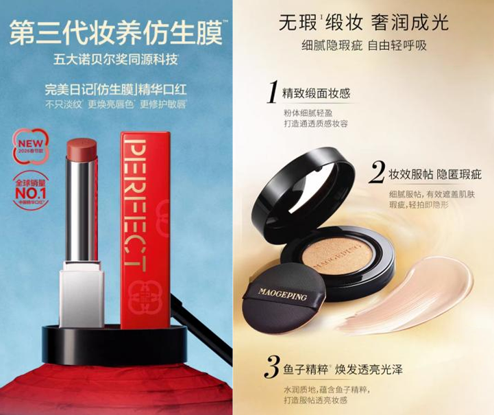 完美日记仿生膜精华口红以专利石榴胜肽,搭载生物科技,兼具妆效与唇部养护;毛戈平鱼子酱气垫则添加鱼子精华和人参精粹等滋养抗老成分,都进一步印证“妆养融合”正成为高端彩妆的研发风向标。