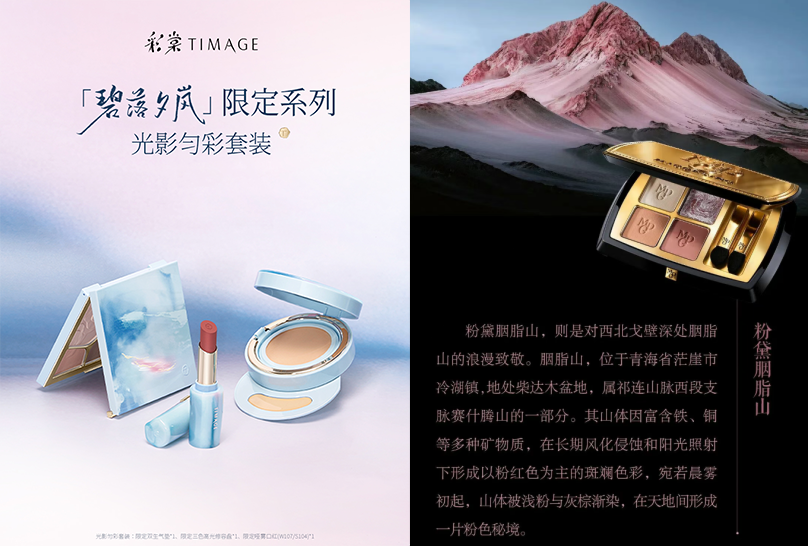 彩棠的“碧落夕岚”系列以传统色和节气为灵感,为消费者塑造山水间、朝霞暮色之时放松、闲适的中式画面。“限定双生气垫、三色高光修容盘等产品,都是蓝调里取来的一抹情绪,色彩温柔洇晕,将水天共色的空灵定格于妆容。”
