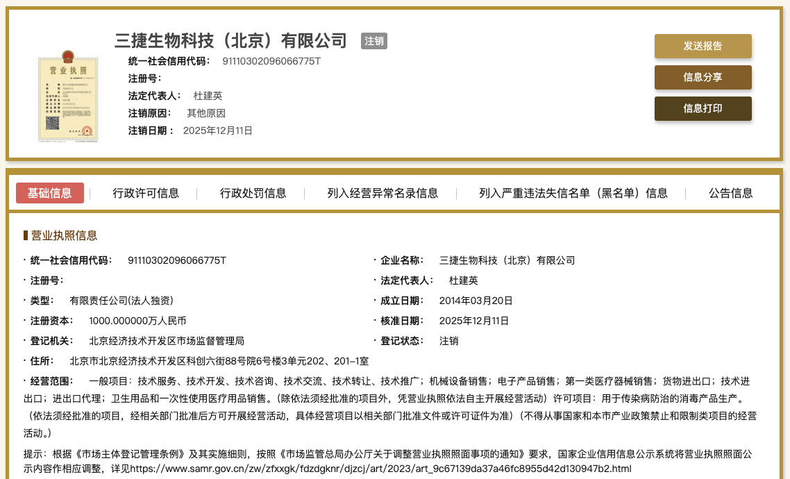 天眼查App显示,三捷生物科技(北京)有限公司成立于2014年3月,法定代表人、执行董事、经理为杜建英,注册资本1000万人民币,经营范围包括机械设备销售、电子产品销售、第一类医疗器械销售等,由三捷投资集团有限公司全资持股。