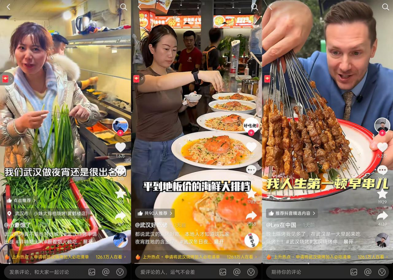 此外,抖音美食达人@楠饱饱、@舌尖武汉、@大魏的胃、@哇塞几张 等也纷纷推荐了武汉的碳烤带子螺、烤糯筋子、吊锅、海兔鱿鱼、烤全羊等特色美食。相关分享迅速点燃网友热情,带动#冬天能同时吃到海鲜和烧烤的地方、#申请将武汉烧烤加入必吃清单、#被武汉烧烤彻底征服了 等5个话题登上抖音热榜。