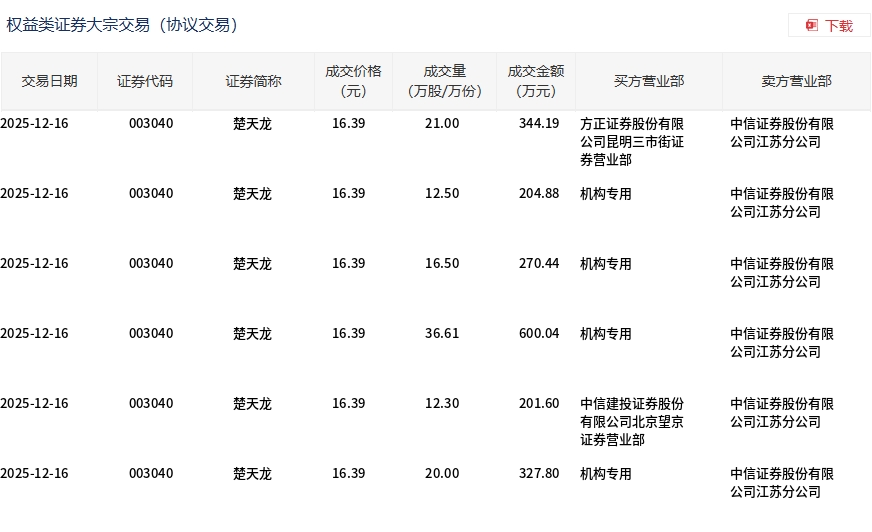 12月16日,楚天龙大宗交易成交118.91万股,成交额1948.95万元,占当日总成交额的3.14%,成交价16.39元,较市场收盘价18.92元折价13.37%。