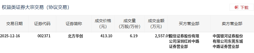 12月16日,北方华创大宗交易成交6.19万股,成交额2557.09万元,占当日总成交额的1.07%,成交价413.1元,较市场收盘价442.88元折价6.72%。