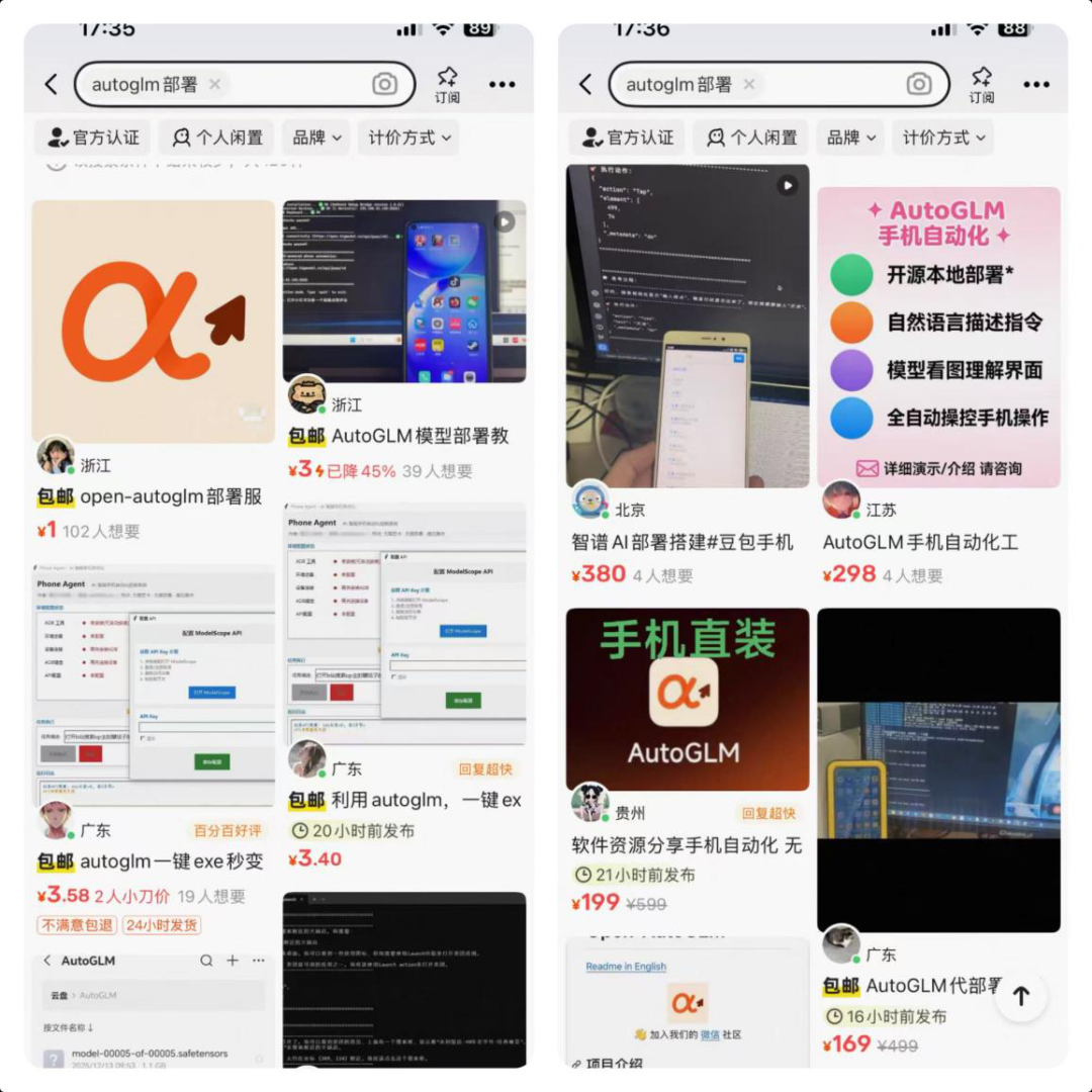 标价个位数的卖家挣的是信息差的钱,通常是一份部署文档需要购买者自己部署操作,甚至大部分标1块钱的卖家就是让用户到应用商店下载AutoGLM,这是一款智谱上架的官方App。而几十元到几百元价格的卖家通常称可以帮助用户本地化部署。