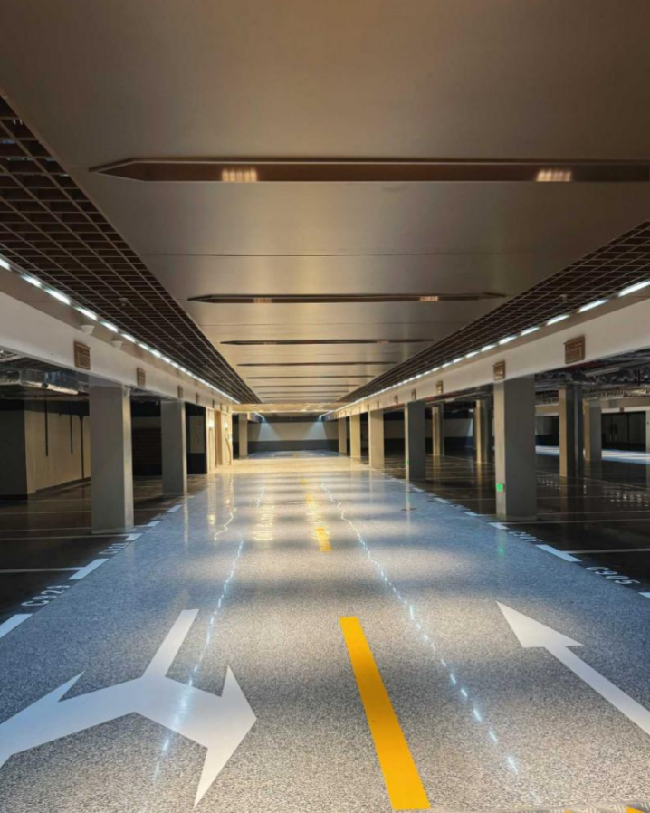 地面呈现出镜面级光泽质感,天然彩石的肌理层次与金刚砂的耐磨属性有机融合,既具备极强的视觉辨识度,更符合高端住宅地下空间使用标准,兼具耐磨、防滑、抗渗、抗老化等多重实用属性,能有效抵御高频次车辆碾压与日常磨损,长期使用仍能保持平整光洁的状态。