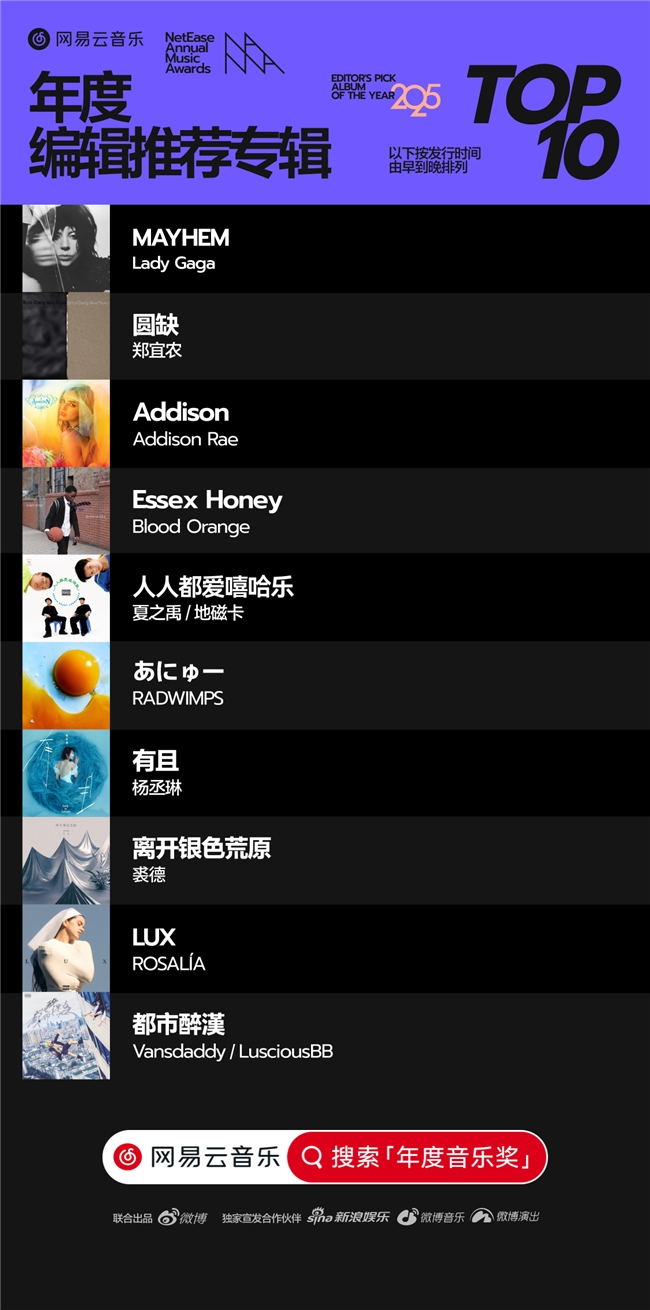 网易云音乐年度音乐奖榜单评选标准基于2025年1月1日至12月12日内网易云音乐新上架作品播放、评论、分享、红心、歌曲质量、演唱者影响力等综合数据。其中,年度畅销数字专辑、实体专辑及单曲依据实际销售排名进行评选;全民热推单曲通过网易云音乐站内新发行歌曲综合榜单全年数据排名得出。网易云音乐年度音乐奖创办于2017年,目前已成为华语乐坛极具影响力的年度音乐盛事,持续受到乐迷、音乐人等的高度认可与广泛好评。多位乐评人称赞年度音乐奖为“质量与流量均衡的榜单”。