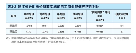 分时电价调整后,浙江省的平均电价差从0.83元/千瓦时缩小至0.50元/千瓦时,投资回收期由5.4年变为9.1年