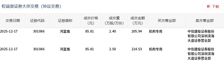 12月17日,鸿富瀚大宗交易成交4.9万股,成交额420.47万元,占当日总成交额的2.15%,成交价85.81元,较市场收盘价100.02元折价14.21%。