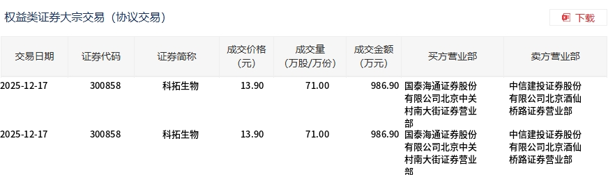 12月17日,科拓生物大宗交易成交142万股,成交额1973.8万元,占当日总成交额的22.32%,成交价13.9元,较市场收盘价16.36元折价15.04%。