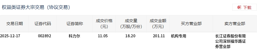 12月17日,科力尔大宗交易成交18.2万股,成交额201.11万元,占当日总成交额的2.29%,成交价11.05元,较市场收盘价12.43元折价11.1%。