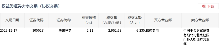 12月17日,华谊兄弟大宗交易成交2952.68万股,成交额6230.16万元,占当日总成交额的28%,成交价2.11元,较市场收盘价2.17元折价2.76%。