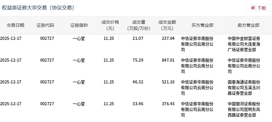 12月17日,一心堂大宗交易成交176.14万股,成交额1981.58万元,占当日总成交额的17.73%,成交价11.25元,较市场收盘价12.66元折价11.14%。