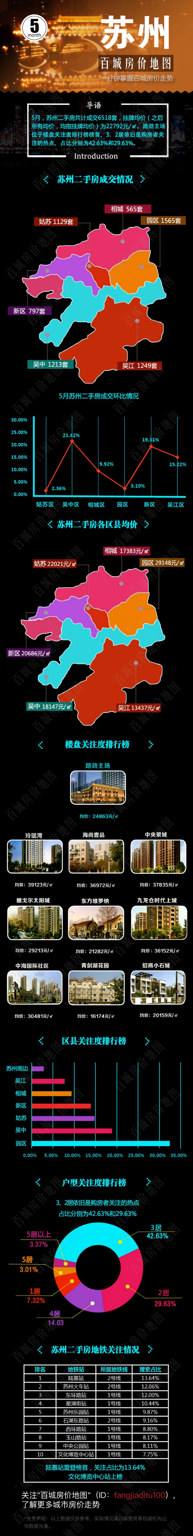 房天下二手房数据中心数据显示,5月苏州二手房共计成交6518套,环比上涨10.74%。其中园区成交量最大,为1565套;吴江和姑苏成交量位居第二、第三,分别为1249、1129套。