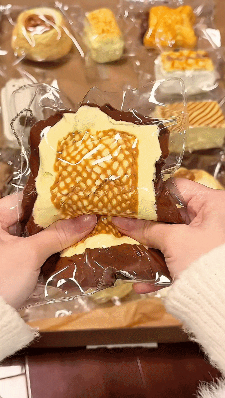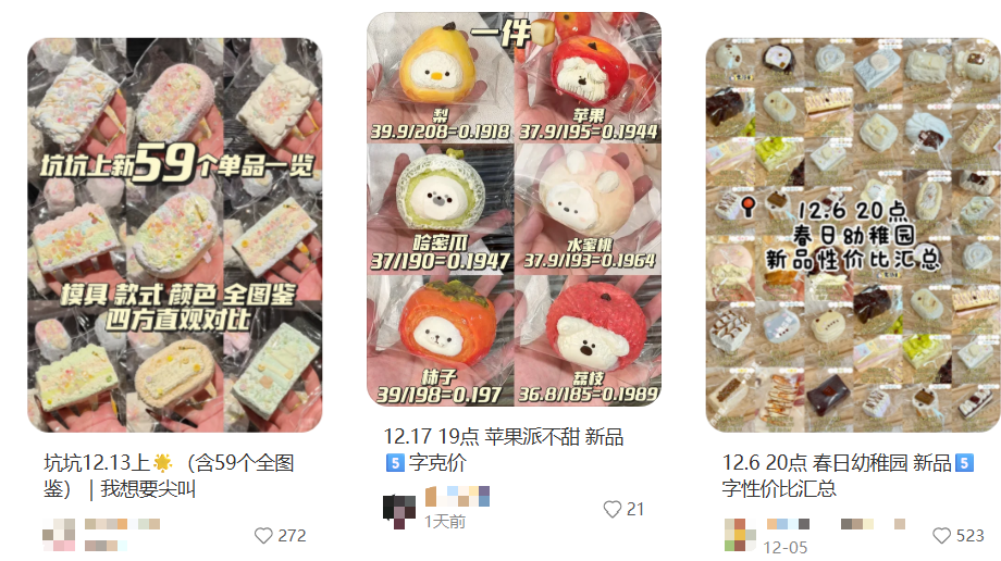眼下最热门的甜品类捏捏,外形绘制极其逼真,造型多到让人恍惚来到大型甜品店,类比下来还有玩偶屋、水果店等等。捏捏手感则是根据材料配比各有千秋,取名更是花里胡哨,好似复刻甜品配料表。
