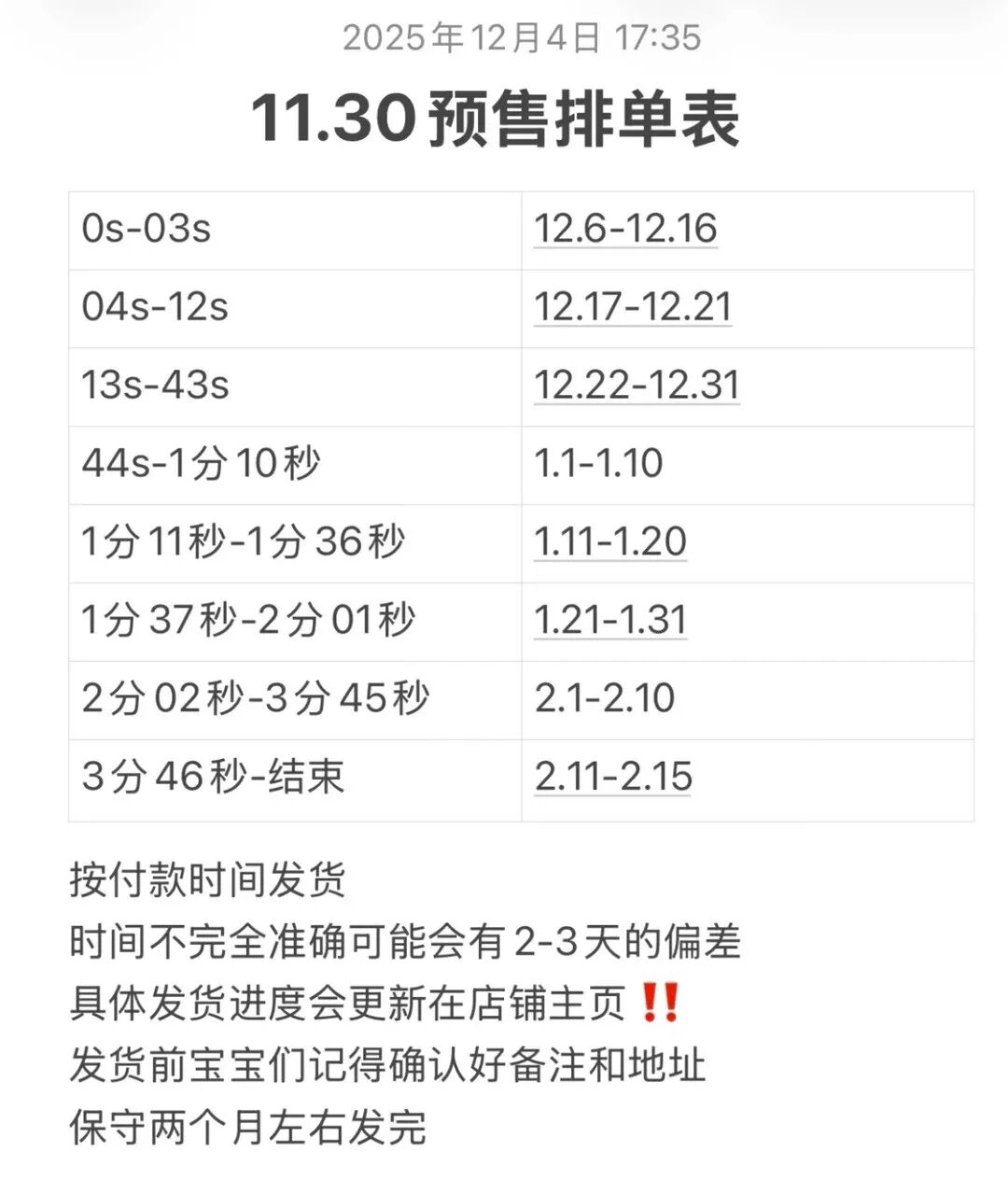 产品以外,大店维系自身热度和客群的标志性手段还是其特殊的销售模式,也就是前文提及的“四字”限时限量和“五字”限时不限量。无论是小羊这样的新人,还是入坑依旧的老玩家,都逃不过极其激烈的限时预售。捏捏店铺每场预售时间都有限制,最长仅有几分钟,短则只有几秒,店家将按照买家下单时间分批次发货,一秒之差或许就要多等几天才能收到货。