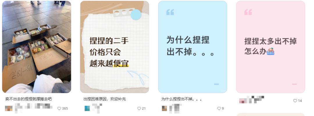 不过二人交流中,最让小羊印象深刻的还是“退坑难”。不只是“草莓冻”多次提及自己想出物退坑,小红书上也时常能看到圈内玩家为此苦恼。归根结底,捏圈即便这两年迎来不少新玩家,但本身并未实现大规模扩圈,高度依赖核心用户的反复消费,当人人手里的捏捏达到饱和,自然很难通过二手市场回血。