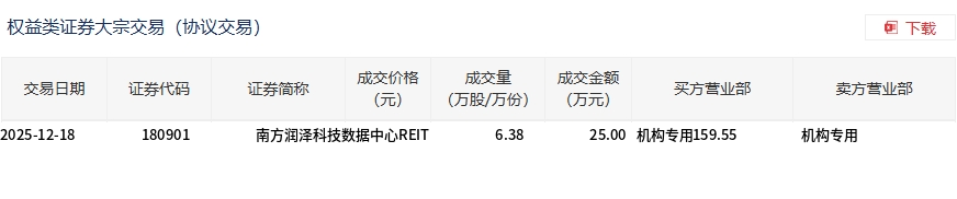 12月18日,南方润泽科技数据中心REIT大宗交易成交25万股,成交额159.55万元,占当日总成交额的12.99%,成交价6.38元,较市场收盘价6.344元溢价0.57%。