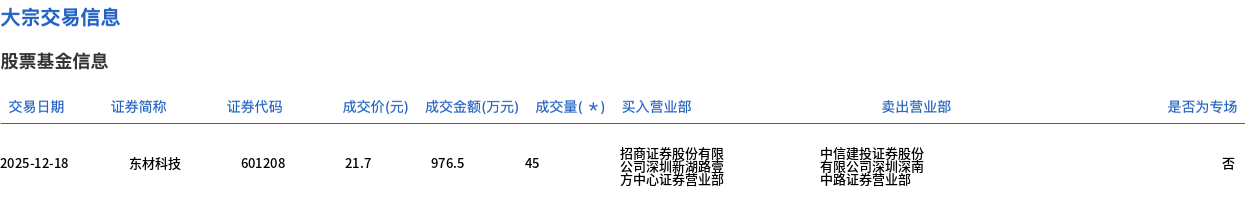 12月18日,东材科技大宗交易成交45万股,成交额976.5万元,占当日总成交额的0.46%,成交价21.7元,较市场收盘价22.49元折价3.51%。