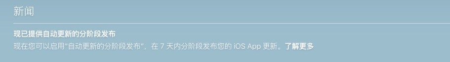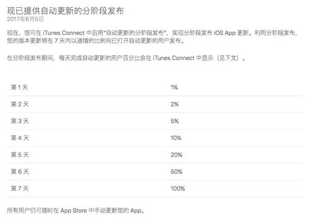 2017年6月5日开始,可在 iTunes Connect 中启用“自动更新的分阶段发布”,实现分阶段发布 iOS App 更新。利用分阶段发布,您的版本更新将在 7 天内以递增的比例向已打开自动更新的用户发布。