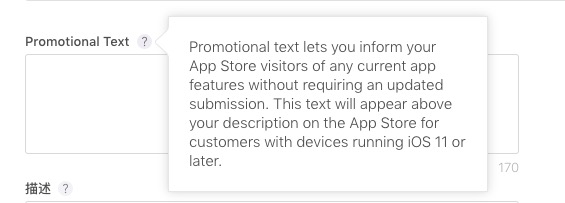 Promotional Text(促销文本)可以让访问产品应用的潜在客户知道关于产品当前的任何功能,Promotional Text栏信息是随时可以更改的,无需通过提交审核来重新迭代。极大的方便了开发者与潜在用户的信息传递,但iOS 11发布后,只能用在OS 11或更高版本的设备上。