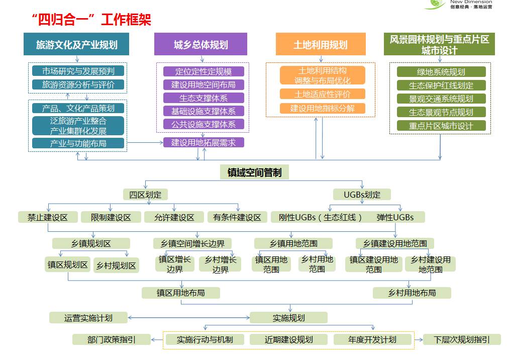 特色小镇以产业规划(主导产业规划、泛旅游产业规划)城乡总体规划、土地利用规划(国有建设用地、集体建设用地等)、景观规划和城市设计四项合一。在规划过程中,导入产业资源、旅游IP、 运营管理机构、开发建造机构、投融资机构等,实现全要素一体化资源导入。 运用互联网思维,实现特色小镇规划中的基础分析、功能产品、保障体系、落地实施、城市营销等方面突破。