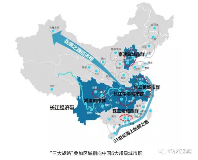 报告指出,在国家规划层面,城市群的发展也将进入加速期,未来中国核心城市群的空间格局也逐渐清晰起来。“一带一路”建设、京津冀协同发展、长江经济带发展三大战略的叠加区域也将是未来发展最具潜力的区域。
